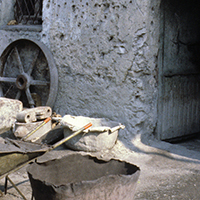 A qu esto punto, il salto finale: l'acqua batte su una grande pietra che và ad azionare un gigantesco mantice. L'aria prodotta dal mantice si immette in un tubo che attraversa le pareti della fonderia e sbuca sotto la grande fornace su cui sono stati collocati i mucchi di carbone accesi, per la fusione del metallo. Il fuoco, così alimentato, acquista sempre più forza fino a quando il rame, posto a contatto diretto dei carboni, comincia a liquefare. La prima fase è compiuta. Si tratta ora di forgiare il metallo secondo le forme che si vogliono imprimere. E' di nuovo il Picentino a provvedere.
